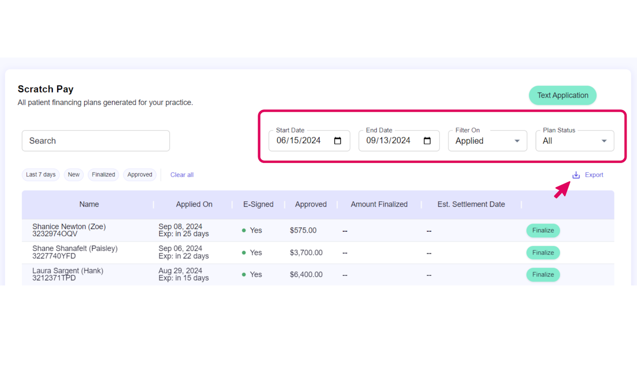 To pull a report for the date range of your choosing, navigate to the Plans tab on your Scratch Dashboard and set the search parameters of your choice. Next, select Export to download or print the report of your choice. This report includes: