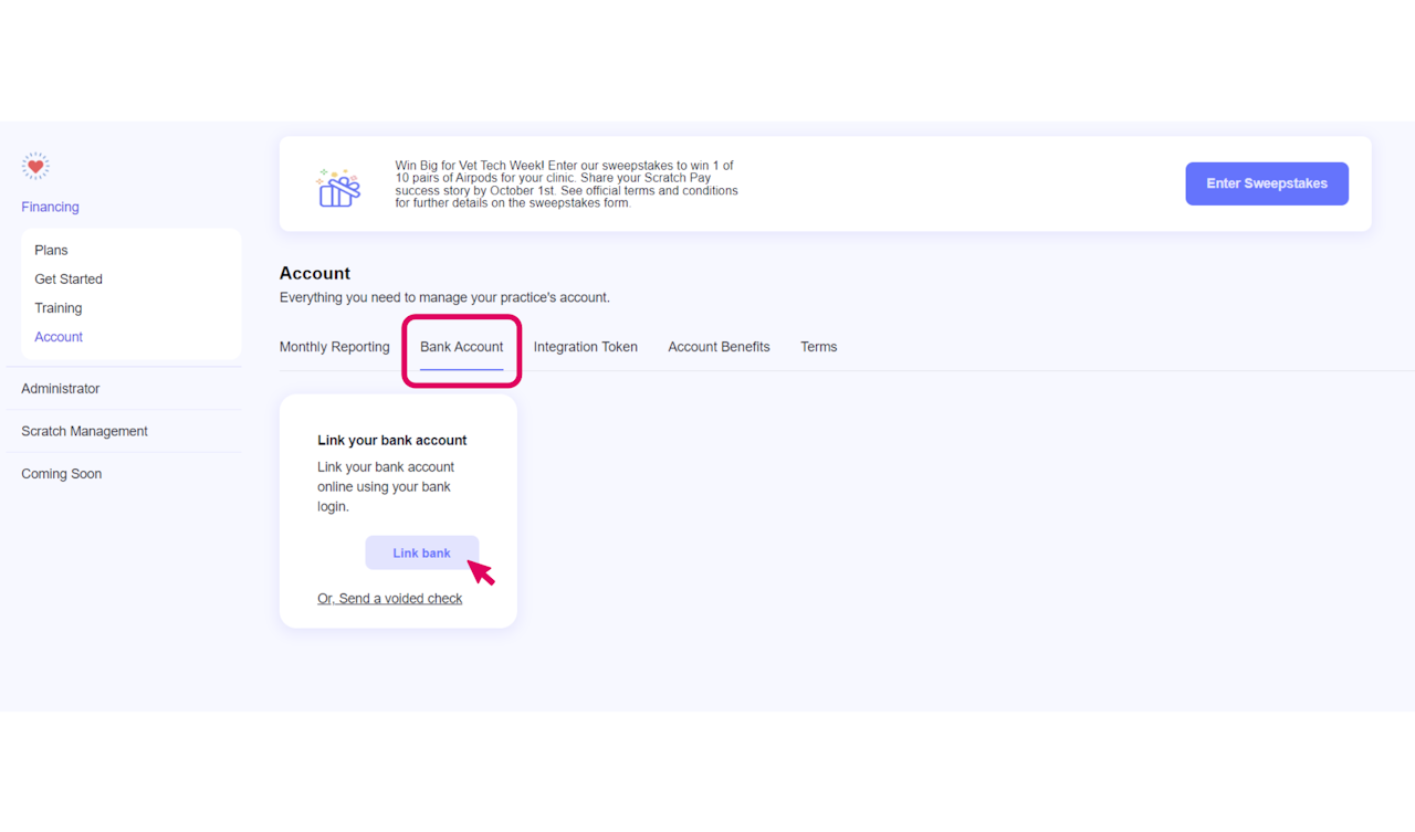 Add or update your practice's bank account by clicking on the Bank Account tile on the Account page of your Scratch Dashboard.