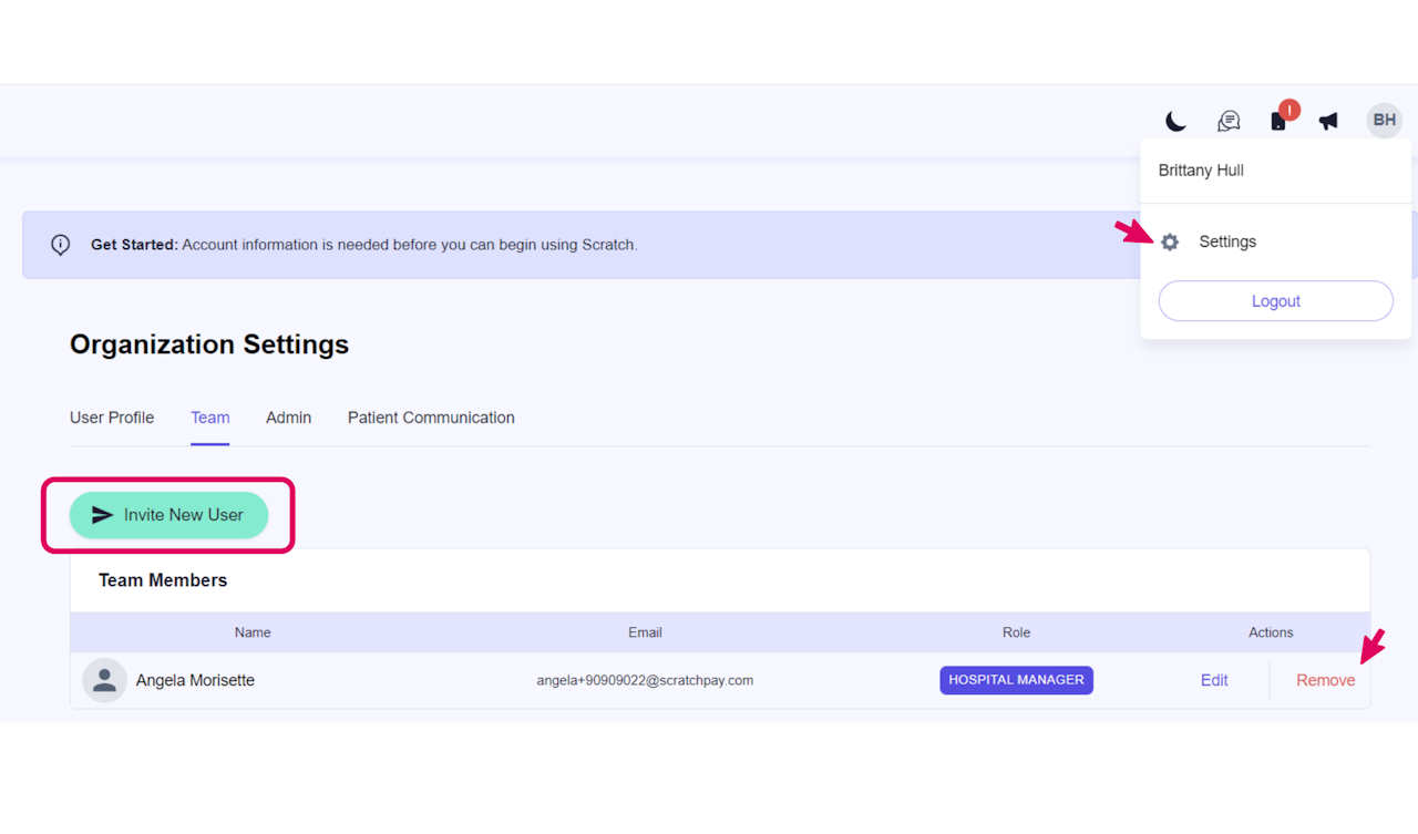Navigate to the Settings area located in the top right of your Scratch Dashboard. Add a new user by clicking the Add New User button. Delete a user by clicking the Remove button next to that email.