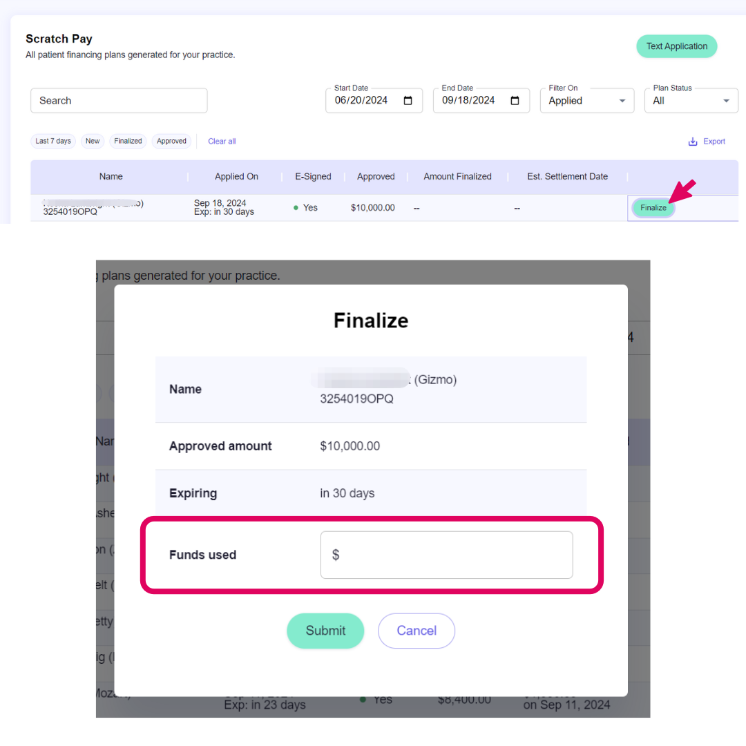 If your client needs to use less than or equal to the total amount of funds available on their Scratch Pay plan (shown in the "Approved" column on your dashboard), simply click Finalize, enter the actual amount of their invoice in the Funds Used field, and click Submit. If needed, they can use any remaining funds prior to the plan expiration date.