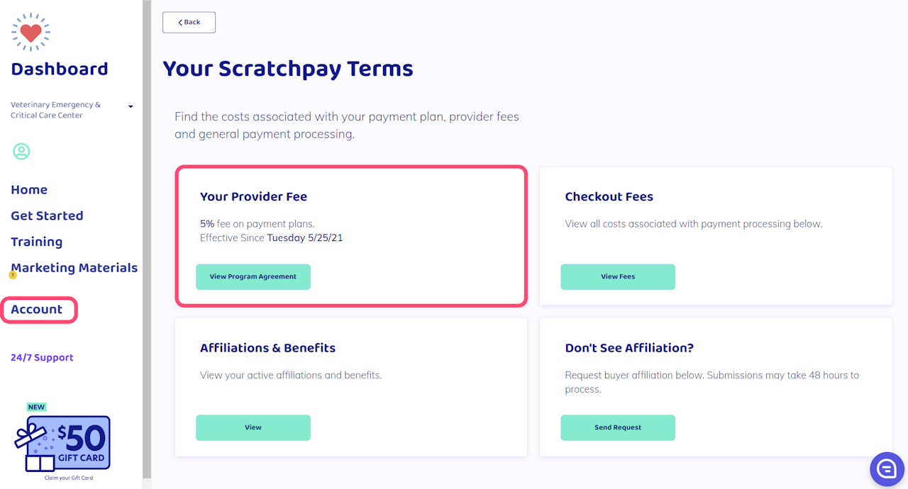You can view your practice's provider fee, group affiliations, benefits and more in the Account tab of your Scratch Dashboard.